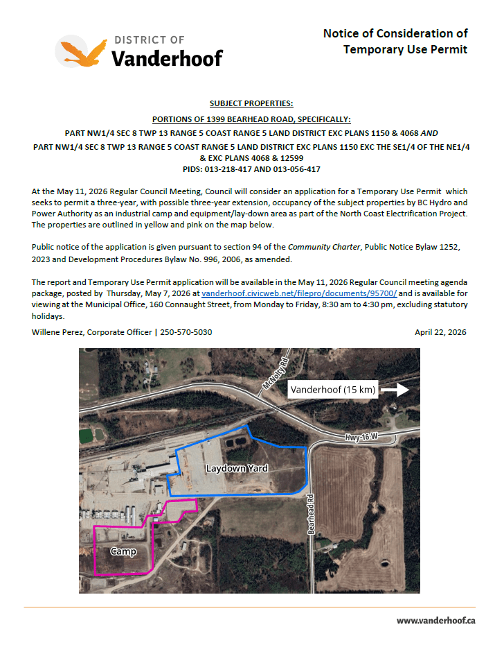 On May 11, 2026 Regular Council Meeting, Council will consider an application for Temporary Use Permit for portions of 1399 Bearhead Road.